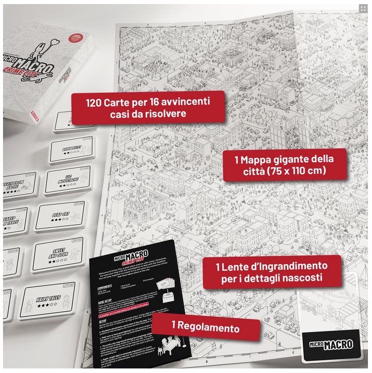 MicroMacro è un gioco cooperativo di investigazione: dovrete risolvere ingegnosi crimini scoprendo il movente, trovando le prove e arrestando i colpevoli. Un occhio attento ai particolari e un lucido ragionamento deduttivo saranno le chiavi del vostro successo. Questo è un lavoro per veri investigatori!
